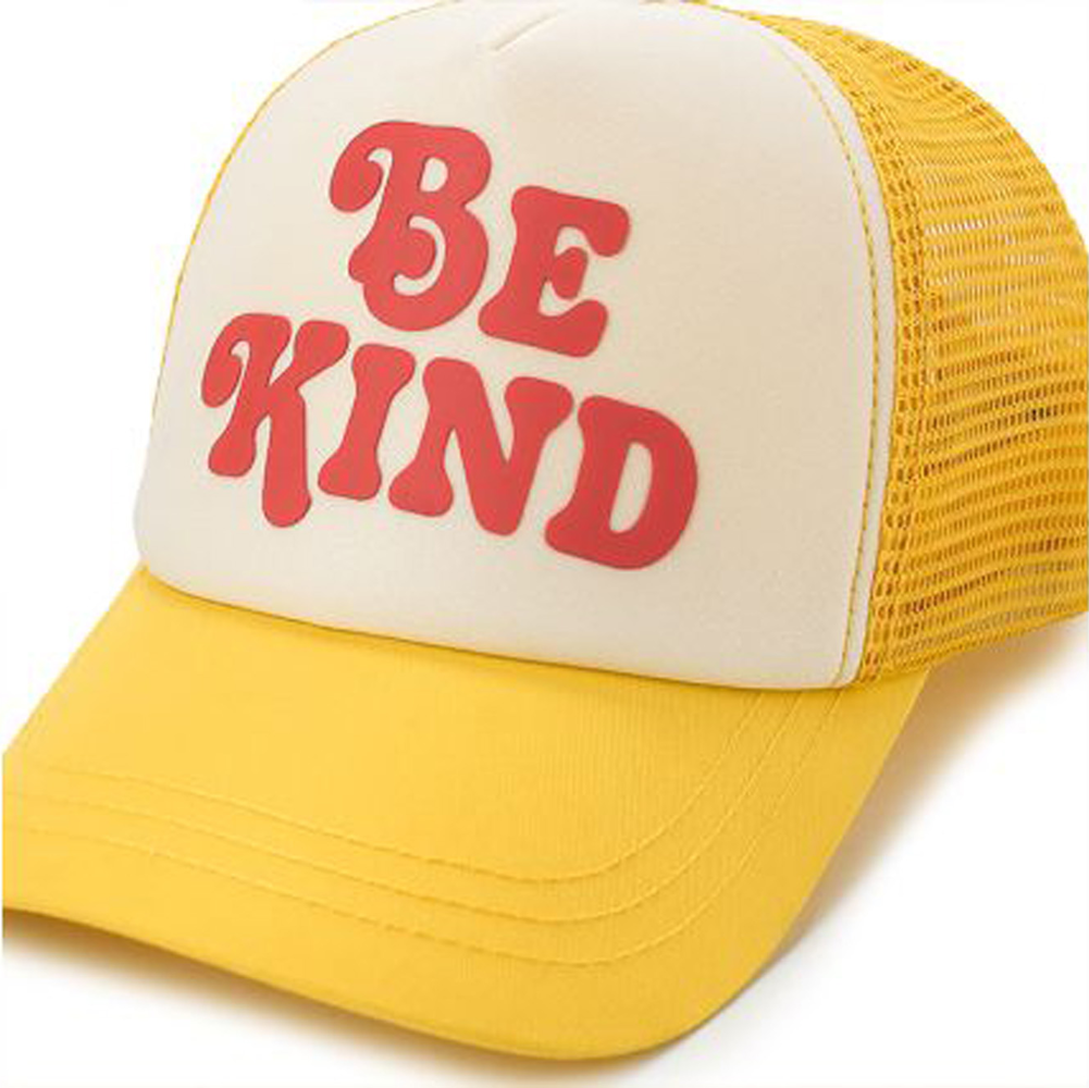 Trucker Cap Dengn Rubber Print "Be Kind" On the Front, Equipped with Strapbacks whose Size Can Be Adjusted And Plastic Adjuster Brand : Hush Puppies color : Multi Color Material : Polyester SKU : CP23008